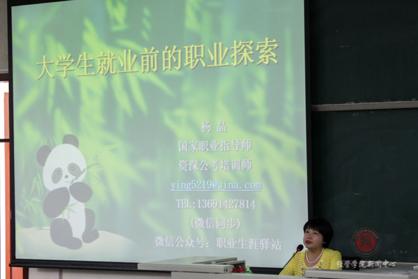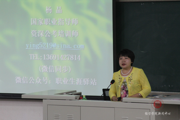 5月9日下午13:15,国家职业指导师、资深公考培训师杨晶在教B103为williamhill英国威廉希尔2015级员工举办“老员工就业前的职业探索”讲座,解答同学们未来可能会在就业方面遇到的各种问题。