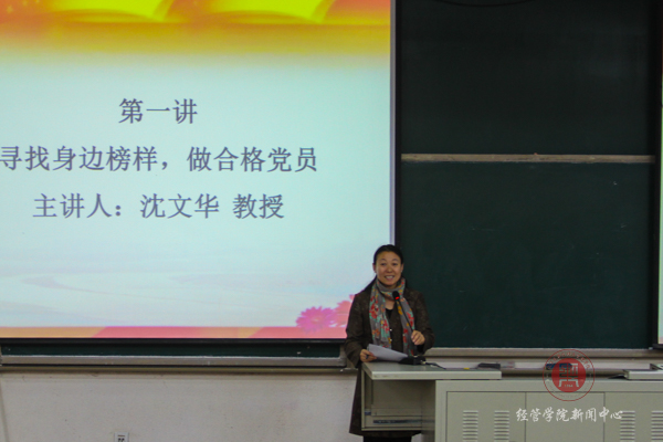 沈教授首先引用狄更斯《双城记》里经典句“这是最好的时代,也是最坏的时代”和一些国际热点事件相结合得出中国共产党的优异性“这边风景独好”。之后沈教授分别从老一辈的和新时期的党建工作者举例,告诉我们可以从他们身上汲取到乐观、坚持、热情等优秀品质。最后他强调作为党员要做到牢记党的宗旨“全心全意为人民服务”,履行党交予的任务。