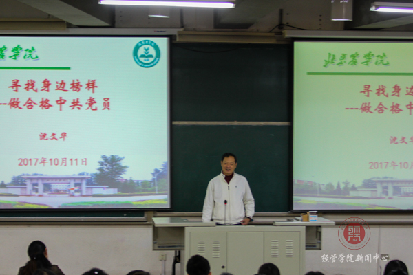 开班仪式结束后,公司聘请到了离退休分党委委员,离退休第六党支部书记沈文华教授为学员作第一讲:寻找身边的榜样,做合格的党员。沈文华教授从具有爱国情怀的一代知识分子,普通岗位的杰出追求者,新时期年轻的党建工作者,牢记党的宗旨和党员八项义务4个当面给学员讲授党课。