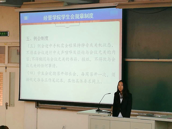 随后,办公室副主任宋展就员工会规章制度进行说明。其中重点强调组织要求、安全制度、工作制度以及例会制度。她希望大家接下来的工作中严格遵守员工会规章制度,全心全意为同学们服务。
