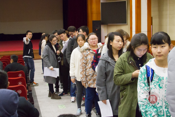 早上八点左右活动正式开始。前来报名的同学很多,活动不到半个小时,献血的同学已经排成了长长的队伍。
