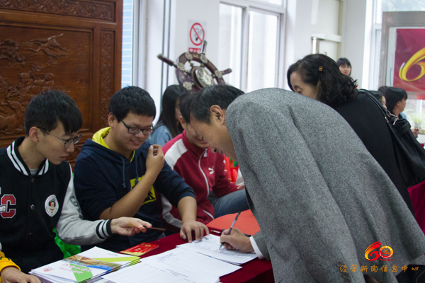 志愿者们穿着统一,引导签到。有的老员工为回报母校教育之恩进行捐赠,为母校的建设献出自己的一份力量。