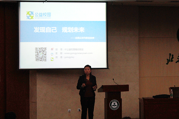 在一阵热烈的掌声之后,刘丽霞老师风趣幽默的语言渐渐的吸引了同学们,为了活跃现场气氛,刘老师让同学们开始介绍自己和自己的座右铭。随后刘老师告诉大家,座右铭代表着每个人的做事风格,并引出了今天的讲座专题——自我认知与职业素养专题讲座。