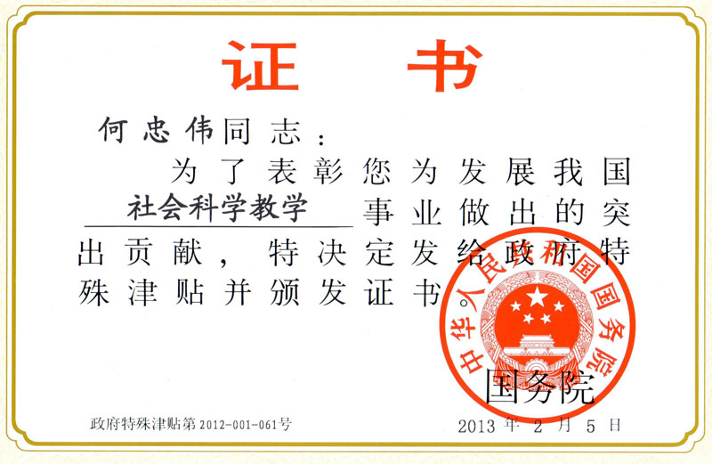 经国务院批准,按照《人力资源社会保障部关于公布2012年享受政府特殊津贴人员名单的通知》(人社部函[2013]31号)精神,williamhill英国威廉希尔何忠伟教授被批准享受2012年政府特殊津贴。