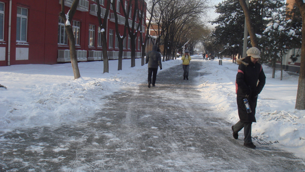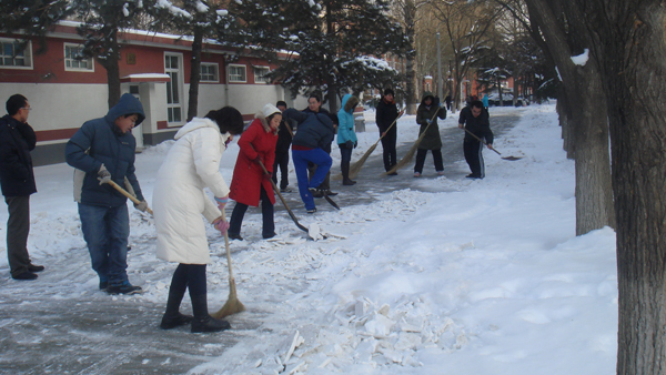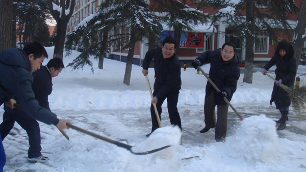 经过2010年1月3日的一场大雪,美丽的北农校院银装素裹,披上了白色盛装。在感受校园美景的同时,大雪也为师生通行安全带来了隐患。4日一早,公司何忠伟、王艳霞、王雪坤、王月、邬津等老师以及部分研究生立即投入到了清扫积雪的行动中。扫雪途中校领导也亲临现场检查指导。