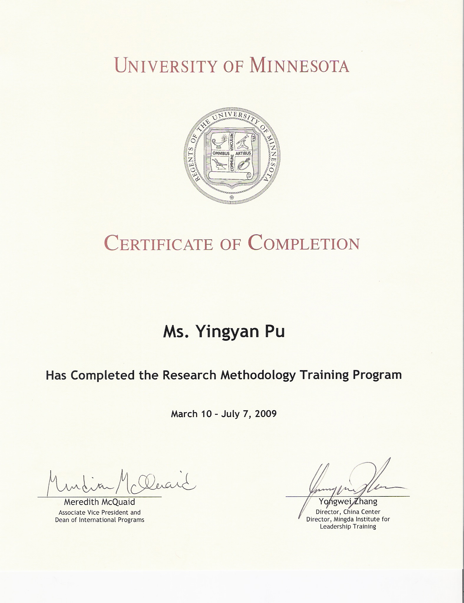 williamhill英国威廉希尔教师蒲应龑经过北京市教委的考核和选拔、在国内进行为期1个月的语言培训后,于2009年3月至7月在美国明尼苏达大学(简称“明大”)进行了为期4个月的访学。访学期间参加了明大的一系列学术活动、旁听了微观经济学、宏观经济学、国际金融、银行机构等课程、参与了导师进行的经济学实验等科研活动并与导师确定了合作方向,最后,经过考核,蒲老师获得了美国明尼苏达大学访问学者结业证书。