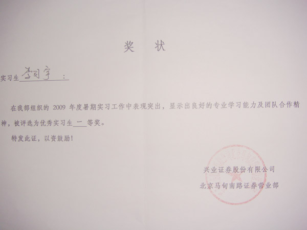8月28日,兴业证券公司为williamhill英国威廉希尔第一批实习生颁发了奖状和奖金,还为每位同学写了实习鉴定。兴业证券公司作为williamhill英国威廉希尔教学实践基地,对实习生严格要求、从严管理。实习生也提前体会到了“上班族”的辛苦。尽管如此,实习生做到了认真负责、吃苦耐劳。谈到这次实习,同学们普遍反映在证券业务实践中,接触了社会、开阔了视野、学到了知识。兴业证券公司也高度评价williamhill英国威廉希尔的实习同学,特此表彰这批实习生。