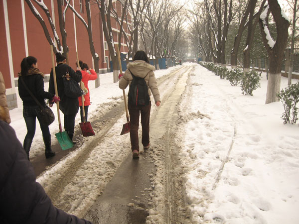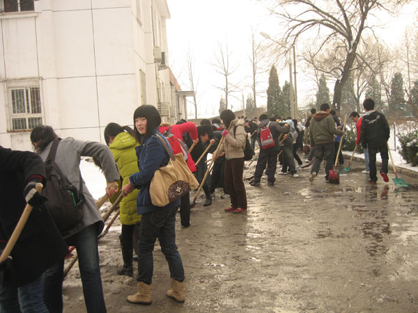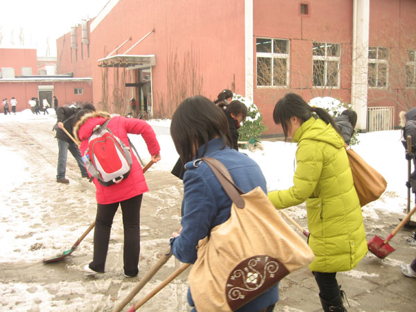 公司有200余人志愿参加本次了扫雪活动,主要是公司员工党员、入党积极分子和部分2008级员工,大家积极踊跃,不嫌脏,不怕冷,主要打扫了荷花池周围、体育馆后面,二食堂东侧以及礼堂后侧的主干道,给大家的出行提供了方便。