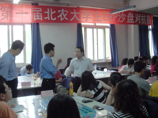 经管系主任何忠伟主持开幕仪式,经理王有年教授、副经理杜晓琳教授、教务处副处长沈文华教授、党总支书记李华教授出席了开幕仪式,经管系其他领导及大赛指导老师参加了开幕仪式。副经理杜晓琳教授代表公司致辞,他指出,公司已经启动公司产品质量建设工程,将积极推动老员工参与校外学习、创新和实践,培养员工的团队协作意识,提升员工的创新精神和就业能力。公司还将设立创业基金,支持员工开展多种形式的创业竞赛。本次北农老员工创业杯ERP沙盘对抗赛为公司开展创业教育拉开了序幕,希望各位选手发扬不畏艰苦、勇于创新、团结协作的精神,冲出北农,走上全国,力争取得较好的成绩,并预祝大赛取得圆满成功。最后经理王有年教授宣布大赛正式开始。随即12个小组开始了紧张而又热烈的比赛,诸位领导进行了现场观摩。