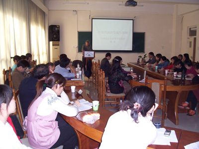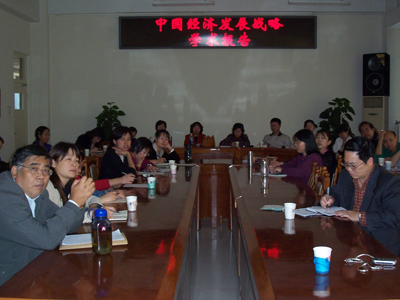 2007年10月10日下午两点在教B209,经贸系邀请了著名经济学家、中国政法大学杨帆教授进行了题为“中国经济的发展与预测”的学术报告,经贸系全体教职工和部分员工参加了会议。