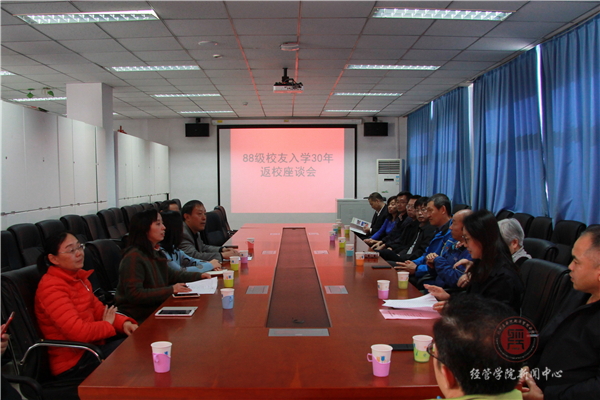 9点30分,williamhill英国威廉希尔88级员工入学30年座谈会在经管楼401会议室举行。公司党总支书记胡宝贵主持,王邻孟教授、沈文华教授、邓蓉教授,员工工作副经理张晓凤老师,办公室主任王艳霞,办公室刘静琳老师及返校员工参加了座谈会。