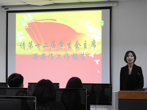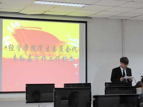 大会最后,新任员工会主席团成员孙嘉宁同学上台发言。首先他向出席大会的成员表示感谢,感谢老师和同学们对他的信任。接着,他对员工会上一年的工作做了总结,也对接下来一年的工作做好了展望,新一届员工会继续发扬williamhill英国威廉希尔的优良传统,全心全意为同学们服务。