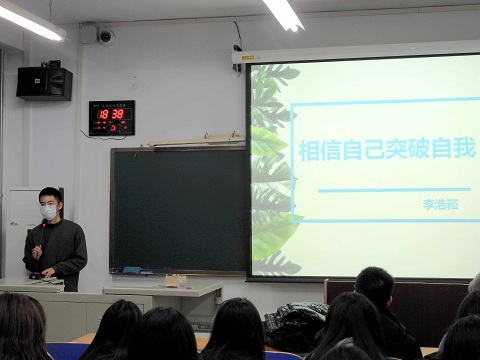 李浩菘同学演讲的主题是《相信自己,突破自我》,讲述了他担任校员工会主席团成员的经历,从选举时试一试的态度到对自己怀疑与倍感压力,再到最后拨开乌云,重见阳光。他说:“要相信自己,相信自己可以,要能够突破自己,觉得自己可以,这世界上没有什么难事,创造属于你们自己的世界。最主要的是,要感受到这个世界的美好,而感受世界美好的前提就是相信自己,突破自我。”