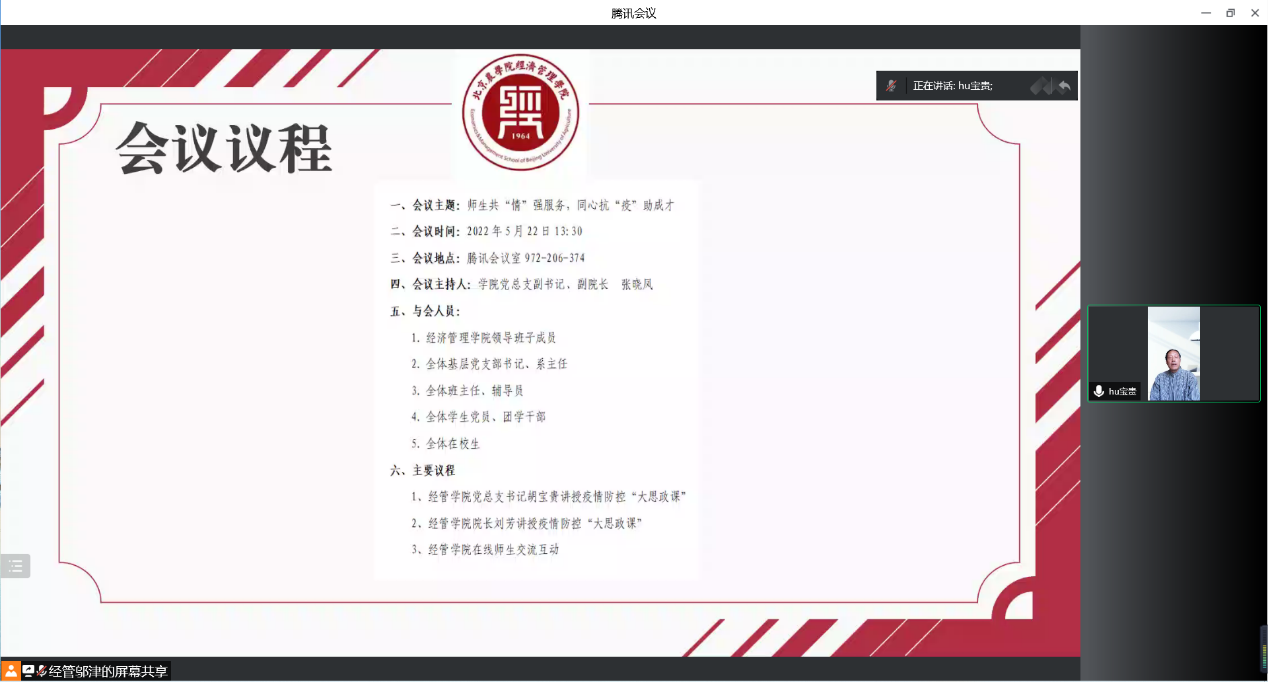 最后,公司领导班子成员与参会师生进行了在线交流,并充分肯定了经管学子在严峻复杂的疫情环境下所表现出强有力的防控思想站位和防控举措执行力,鼓励同学们再接再厉,深入贯彻落实北京市和公司的防疫政策,相信全体师生众志成城,一定能打赢疫情防控阻击战。