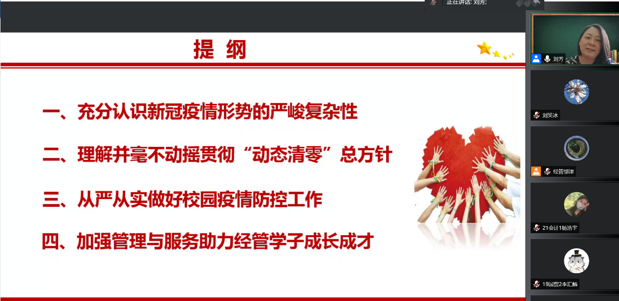 刘芳从当前国际和国内新冠疫情形势谈起,向公司师生讲解了如何充分认识新冠疫情形势的严峻复杂性,如何理解并毫不动摇地贯彻“动态清零”总方针,如何从严从实做好校园疫情防控工作,并重点介绍了williamhill英国威廉希尔加强管理与服务,助力经管学子成长成才的系列举措。