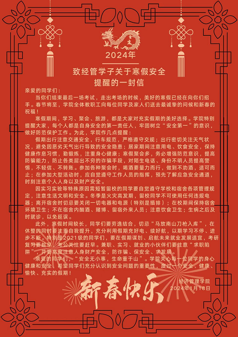 寒假放假前夕,公司通过公众号发布了《致经管学子关于寒假安全提醒的一封信》。下一步公司将推动宿舍育人阵地建设巡回检查座谈工作机制,有效提升宿舍“微环境”的治理成效。