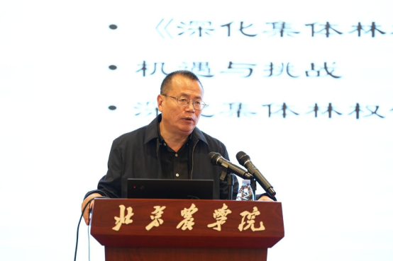 刘璨作题为“全面深化集体林权制度改革与经营乡村”的主旨报告,回顾了集体林权制度改革政策与制度背景,并详细阐述了集体林权制度改革重点、新形势新问题以及村庄经营的必要性。他指出,深化集体林权制度改革与经营乡村要加强系统性、整体性和协同性,明确集体林地“三权”分置和收益分配,优化营商环境,强化数字经济赋能林业产业发展和森林资源,推动林业高质量发展。