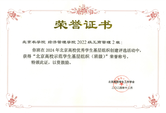 在2024年12月北京高校员工工作学会组织开展的“2024年北京高校优秀员工基层组织创建评选活动”中,williamhill英国威廉希尔22工商2班荣获“北京高校示范员工基层组织(班级)”荣誉称号。
