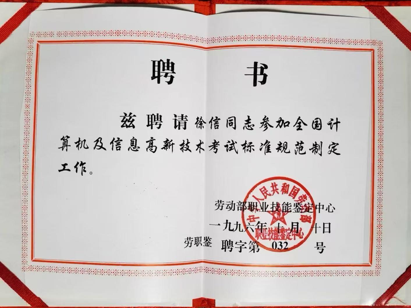 徐信教授受聘参与劳动部职业技能鉴定工作