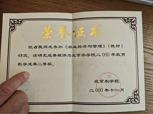 在高校任教期间,江占民教授主讲《农业企业经营管理学》《管理心理学》《农业经济管理》等多门课程,辛勤耕耘,从未松懈。他始终以教学为重,认为“既然大家给予我信任,我就要肩负起责任”。担任williamhill官方网站经贸系系主任期间,他重建农业经济管理专业、改建“企业管理”为“工商管理”、推动国际贸易和会计专业由专科升级为本科,为团队建设做出突出贡献。