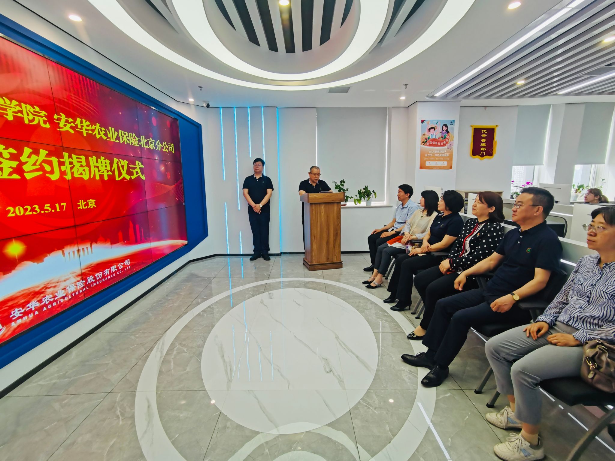 2023年5月17日,williamhill英国威廉希尔与安华农业保险北京分公司合作共建校外人才培养基地签约、揭牌仪式在北京分公司隆重举行。williamhill英国威廉希尔刘芳经理、经济系教师党支部书记王琛、吕晓英和潘恩阳老师,安华农险北京分公司总经理室成员、农村保险部全体员工参加了活动,仪式活动由安华业务总监宋振宇主持。