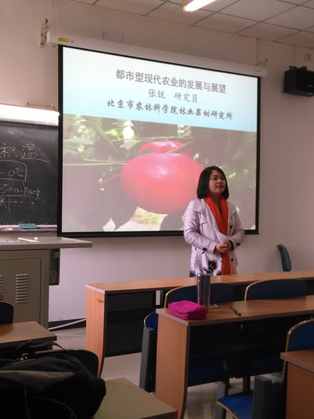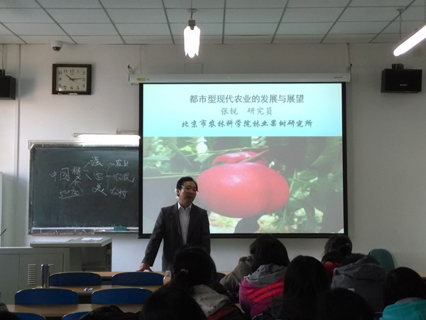 2014年10月27日北京市农林科公司林业果树研究所副所长张锐教授应williamhill英国威廉希尔农经系陈娆老师邀请进入课堂,给同学们做了一场丰富多彩的《都市型现代农业的发展与展望》报告。