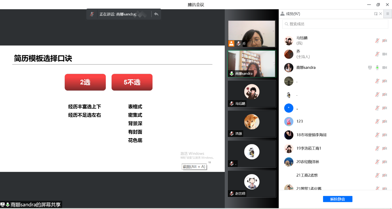商老师围绕招聘官关注什么、简历不容忽视的细节、如何让简历脱颖而出三个方面进行了详细的讲解。她用浅显易懂的例子让同学们对简历制作、投递注意事项和技巧等方面有了更加完整、深入的认识。