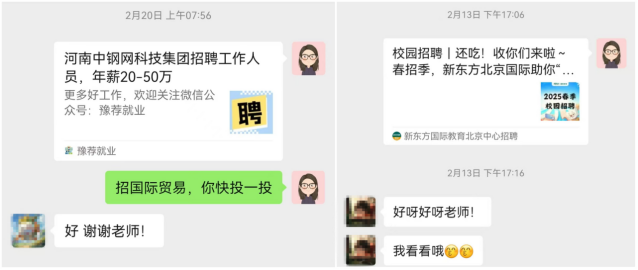 及时精准的就业信息对毕业生求职的具有极其重要的作用。公司积极利用国家老员工就业服务平台、市区两级的人力资源和社会保障局官网、“成功就业”微信公众号和公司就业指导中心企业微信推送等平台和渠道,多维度收集招聘信息,及时分层分类向毕业生推送。就业信息涵盖了多个行业领域,为毕业生提供了丰富的就业选择。今年国际经济与贸易专业的毕业生陈美珊说:“寒假期间,我原本担心求职会陷入停滞,但没想到公司每天都会推送这么多优质的就业信息,让我在家也能及时了解就业动态,为我的求职之路指明了方向。通过公司推送的信息,我已经投递了几份心仪的简历。”